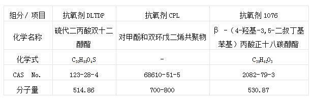 主要組成: (1)抗氧劑DLTDP 、抗氧劑CPL (2) 抗氧劑DLTDP 、抗氧劑CPL、抗氧劑1076