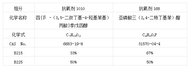 抗氧劑B215/B225是高分子受阻酚抗氧劑1010和亞磷酸酯抗氧劑168組合的復合抗氧劑,B215/B225易溶于苯類、氯仿、乙酸乙酯等有機溶劑。對聚烯烴具有突出的加工穩定性和對其制品有長效保護作用。該復合抗氧劑揮發性小,熱穩定高,耐抽出性好,可有效的地抑制塑料的熱降解和氧化降解。本品適用于聚烯烴、聚碳酸酯、ABS和線性聚酯。一般用量0.05%-0.3%。