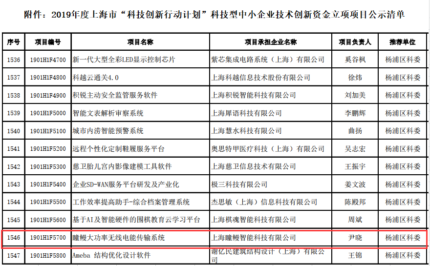 根據《中共中央辦公廳、國務院辦公廳關于深化項目評審、人才評價、機構評估改革的意見》等文件要求及工作計劃安排,2019年度“科技創新行動計劃” 科技型中小企業技術創新資金項目共有3000多加企業申報,其中上海瞳鰻智能科技有限公司的“瞳鰻大功率無線電能傳輸系統“成功入選。